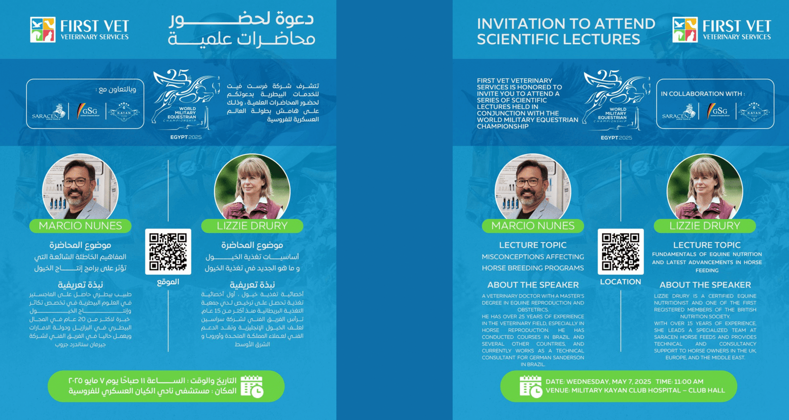 Scheduled for Wednesday, May 7, 2025, at 11:00 AM, these lectures will bring together leading experts, professionals, and enthusiasts from across the region. The sessions will highlight the latest research, technologies, and practical approaches in veterinary medicine, with a focus on the essential role veterinary care plays in supporting elite equestrian sports and the welfare of horses.