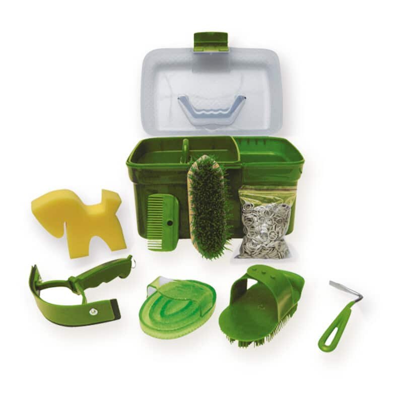 The S2G Grooming Box Junior – Filled (Green) is a thoughtfully curated set of fundamental grooming tools designed for young equestrians, beginners, or as a compact travel kit. Housed in a durable, easy-to-carry green grooming box, this set includes everything needed for thorough daily care: a sweat scraper to remove moisture, a rubber curry comb and needle curry comb for loosening embedded dirt and promoting circulation, a hoof pick for cleaning feet, a sponge for wiping sweat or dust, a mane comb and mane brush for detangling, and a selection of mane bands to secure braids. Whether used at the stable, during lessons, or on show days, this all-in-one grooming box helps keep horses well-groomed and comfortable with practical, beginner-friendly tools.