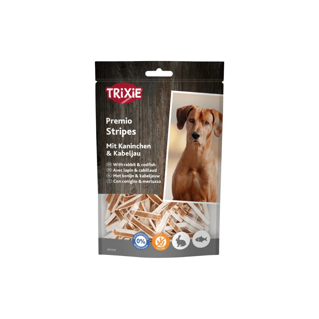 Trixie Premio Stripes with Rabbit & Codfish are protein‑dense treats crafted from 68 % rabbit and 15 % cod, offering a tasty and nutritionally rich snack experience. Their compact strip design is easy to portion and makes them excellent for on‑going reward throughout the day. With no added sugar or gluten, and a high crude protein content (30 %) and low fat (3.5 %), these treats support lean muscle health and suit dogs with dietary sensitivities.